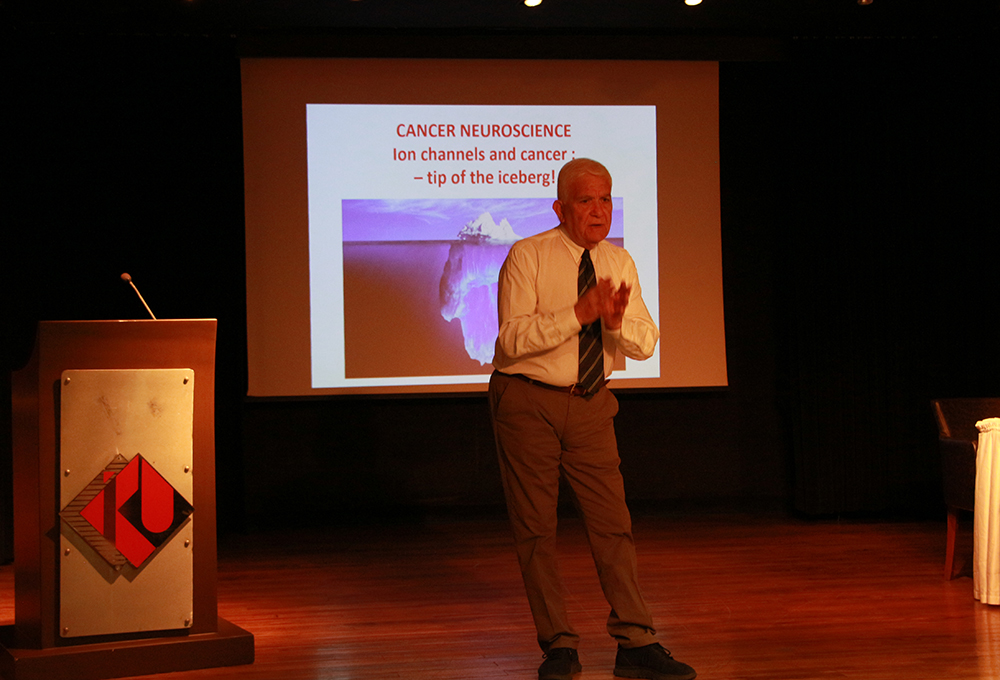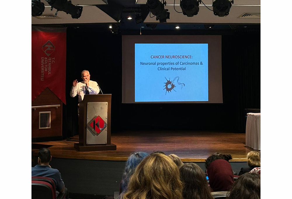 Seminerde; kanser hücrelerinin sinirsel özellikleri, iyon kanalları aracılığıyla tümör ilerlemesi ve bu mekanizmaların klinik tedavi stratejilerindeki potansiyeli ele alındı. Katılımcılar, kanserin nörobiyolojik yönüne dair güncel bulgular hakkında kapsamlı bilgiler edinme fırsatı buldu. Bioelectricity dergi editörü TÜBİTAK bilim ödüllü Prof. DJAMGOZ, seminerin ardından İKÜ araştırma laboratuvarlarını ziyaret ederek, yürütülen çalışmalar hakkında bilgi aldı ve araştırma birliktelikleri değerlendirildi.